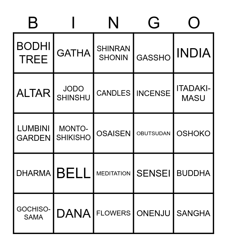 This bingo card has a free space and 24 words: BELL, DANA, CANDLES, GOCHISO-SAMA, INDIA, BODHI TREE, ALTAR, GATHA, OBUTSUDAN, MEDITATION, INCENSE, LUMBINI GARDEN, SENSEI, BUDDHA, JODO SHINSHU, ONENJU, OSHOKO, SHINRAN SHONIN, ITADAKI-MASU, MONTO-SHIKISHO, SANGHA, DHARMA, GASSHO and FLOWERS.