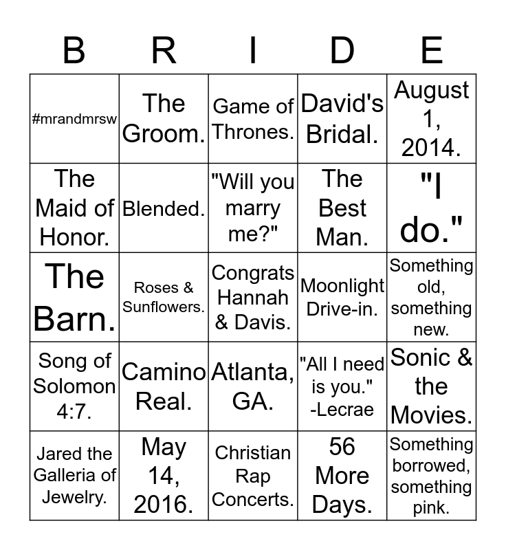 This bingo card has a free space and 30 words: May 14, 2016., May 31, 2015., Roses & Sunflowers., Gatlinburg, TN., #mrandmrsw, Game of Thrones., Blended., Atlanta, GA., Moonlight Drive-in., Christian Rap Concerts., Something old, something new., Something borrowed, something pink., 56 More Days., 1 Corinthians 13., "I do.", Red Velvet Cake., "All I need is you." -Lecrae, Song of Solomon 4:7., Camino Real., August 1, 2014., The Barn., The Bride., The Groom., The Best Man., The Maid of Honor., David's Bridal., Sonic & the Movies., Jared the Galleria of Jewelry., "Will you marry me?" and Strawberry Shortcake Ice Cream Bars..