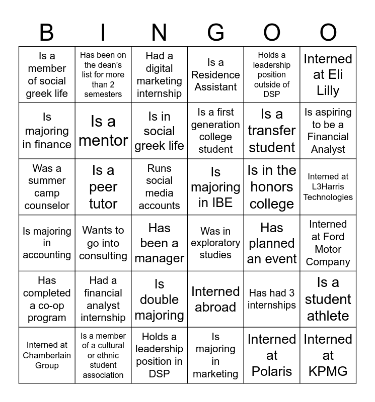 This bingo card has 36 words: Interned abroad, Is double majoring, Is majoring in marketing, Is majoring in finance, Is majoring in accounting, Is majoring in IBE, Is a mentor, Holds a leadership position in DSP, Holds a leadership position outside of DSP, Has had 3 internships, Is aspiring to be a Financial Analyst, Is a Residence Assistant, Is a student athlete, Is a peer tutor, Is a first generation college student, Is a member of social greek life, Has completed a co-op program, Is in the honors college, Was a summer camp counselor, Had a digital marketing internship, Runs social media accounts, Wants to go into consulting, Was in exploratory studies, Has been a manager, Has planned an event, Has been on the dean’s list for more than 2 semesters, Is a transfer student, Is a member of a cultural or ethnic student association, Is in social greek life, Interned at Eli Lilly, Interned at KPMG, Interned at Chamberlain Group, Interned at Ford Motor Company, Interned at L3Harris Technologies, Had a financial analyst internship and Interned at Polaris.