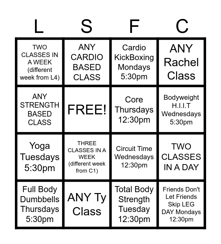 This bingo card has 16 words: ANY Ty Class, TWO CLASSES IN A DAY, Cardio KickBoxing Mondays 5:30pm, TWO CLASSES IN A WEEK (different week from L4), Yoga Tuesdays 5:30pm, ANY CARDIO BASED CLASS, Circuit Time Wednesdays 12:30pm, Total Body Strength Tuesday 12:30pm, ANY STRENGTH BASED CLASS, FREE!, Full Body Dumbbells Thursdays 5:30pm, ANY Rachel Class, THREE CLASSES IN A WEEK (different week from C1), Bodyweight H.I.I.T Wednesdays 5:30pm, Core Thursdays 12:30pm and Friends Don't Let Friends Skip LEG DAY Mondays 12:30pm.