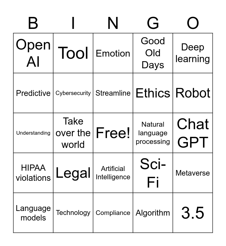 This bingo card has a free space and 47 words: Responses, 3.5, Neural networks, Compliance, Legal, Machine learning, Tool, Alexa, Predictive, Efficiency, Cybersecurity, Good Old Days, Metaverse, Sci-Fi, Edit, Draft, Streamline, Natural language processing, Chatbot, Deep learning, Take over the world, Algorithm, Open AI, Ethics, Acceptable Use Policy, Robot, Language models, Human, Artificial Intelligence, HIPAA violations, Privacy, Security, Transforming, Risky, The future, Technology, Chat GPT, Innovation, Judgment, Virtual assistant, Bias, Emotion, Understanding, Conversation, Use cases, Policies and Chat.
