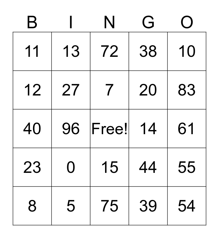 This bingo card has a free space and 24 words: 0, 5, 7, 8, 10, 11, 12, 13, 14, 15, 20, 40, 44, 55, 27, 39, 61, 72, 83, 96, 54, 23, 38 and 75.