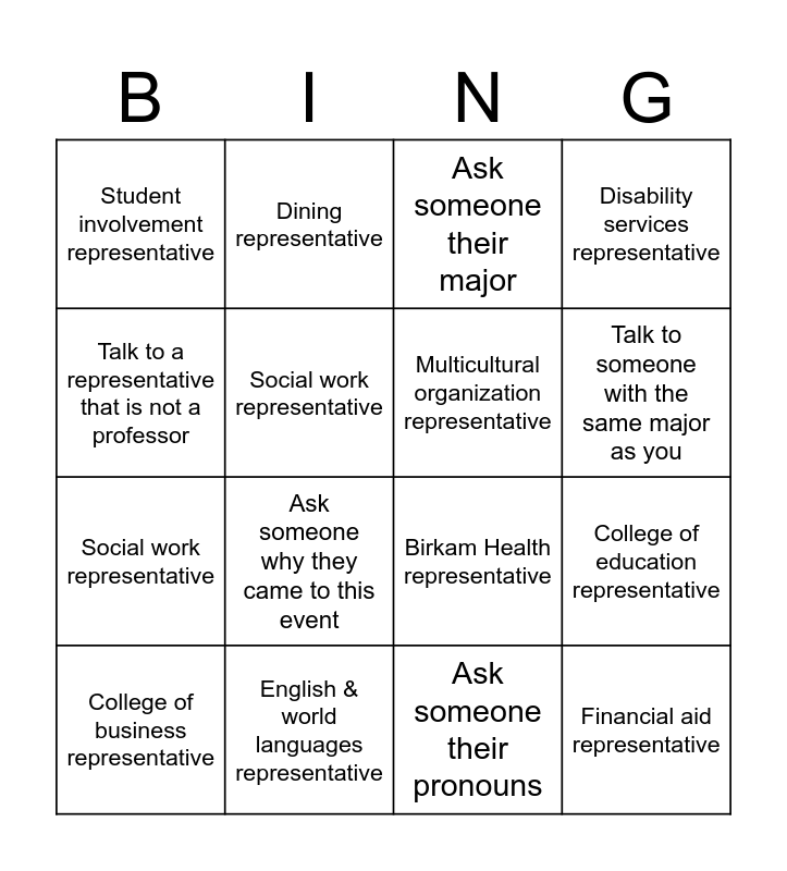 This bingo card has 28 words: Free!, Talk to a daise e-board member, Social work representative, Talk to a daise e-board member, Social work representative, Ask someone their major, Dining representative, Financial aid representative, English & world languages representative, Student government representative, Birkam Health representative, Disability services representative, Ready for life representative, Academic literacies center representative, Ask someone why they came to this event, Pharmacy representative, Health Professions representative, Multicultural organization representative, Talk to someone with the same major as you, Student life representative, Student involvement representative, Optometry representative, College of business representative, College of education representative, Ask someone their pronouns, Talk to a professor, Talk to a representative that is not a professor and CREW representative.