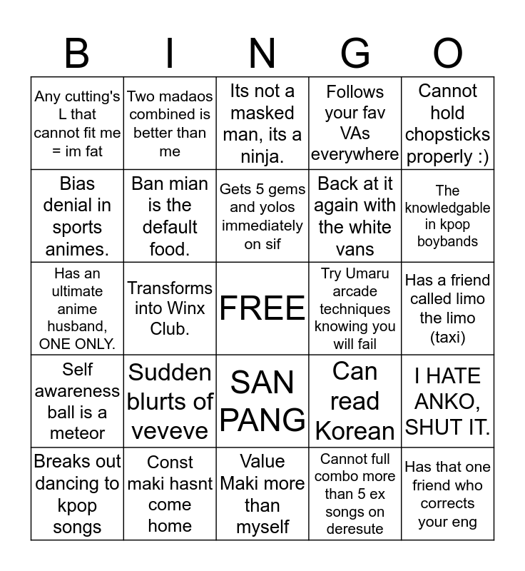 This bingo card has a free space and 24 words: Sudden blurts of veveve, Const maki hasnt come home, Gets 5 gems and yolos immediately on sif, Breaks out dancing to kpop songs, Cannot hold chopsticks properly :), Any cutting's L that cannot fit me = im fat, Bias denial in sports animes., Two madaos combined is better than me, Try Umaru arcade techniques knowing you will fail, SAN PANG, Back at it again with the white vans, Has an ultimate anime husband, ONE ONLY., Can read Korean, I HATE ANKO, SHUT IT., Ban mian is the default food., Cannot full combo more than 5 ex songs on deresute, Has a friend called limo the limo (taxi), Its not a masked man, its a ninja., The knowledgable in kpop boybands, Transforms into Winx Club., Has that one friend who corrects your eng, Self awareness ball is a meteor, Follows your fav VAs everywhere and Value Maki more than myself.