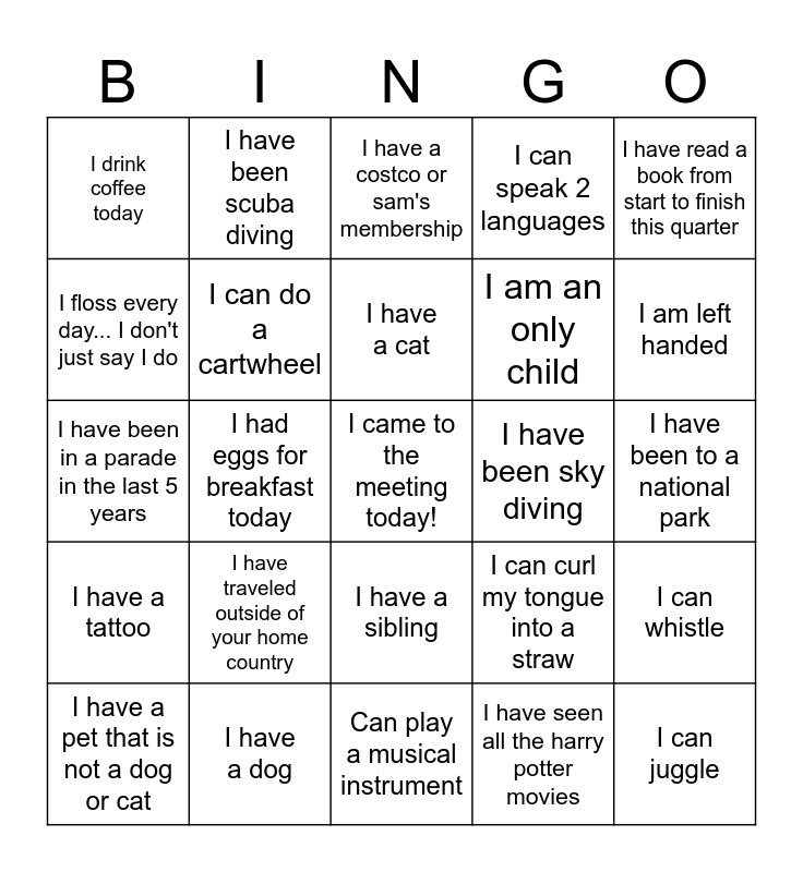 This bingo card has a free space and 24 words: I have traveled outside of your home country, I have a dog, I have a cat, I have a pet that is not a dog or cat, I have read a book from start to finish this quarter, I drink coffee today, I floss every day... I don't just say I do, I have been scuba diving, I have been sky diving, I have a sibling, I am an only child, I have been in a parade in the last 5 years, I can curl my tongue into a straw, I can whistle, I can do a cartwheel, I have seen all the harry potter movies, I have been to a national park, I have a costco or sam's membership, I am left handed, I had eggs for breakfast today, I can juggle, I have a tattoo, I can speak 2 languages and Can play a musical instrument.