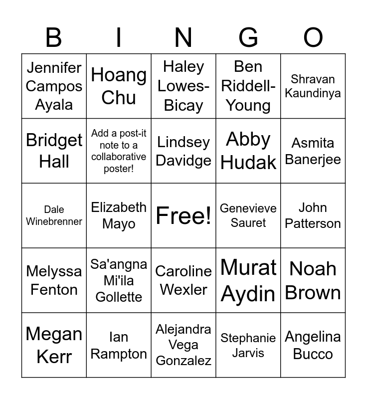 This bingo card has a free space and 24 words: Sa'angna Mi'ila Gollette, Ian Rampton, Lindsey Davidge, Megan Kerr, Shravan Kaundinya, Jennifer Campos Ayala, Bridget Hall, Hoang Chu, Genevieve Sauret, Caroline Wexler, Abby Hudak, Dale Winebrenner, Murat Aydin, Noah Brown, Add a post-it note to a collaborative poster!, Stephanie Jarvis, John Patterson, Haley Lowes- Bicay, Asmita Banerjee, Elizabeth Mayo, Angelina Bucco, Melyssa Fenton, Ben Riddell- Young and Alejandra Vega Gonzalez.