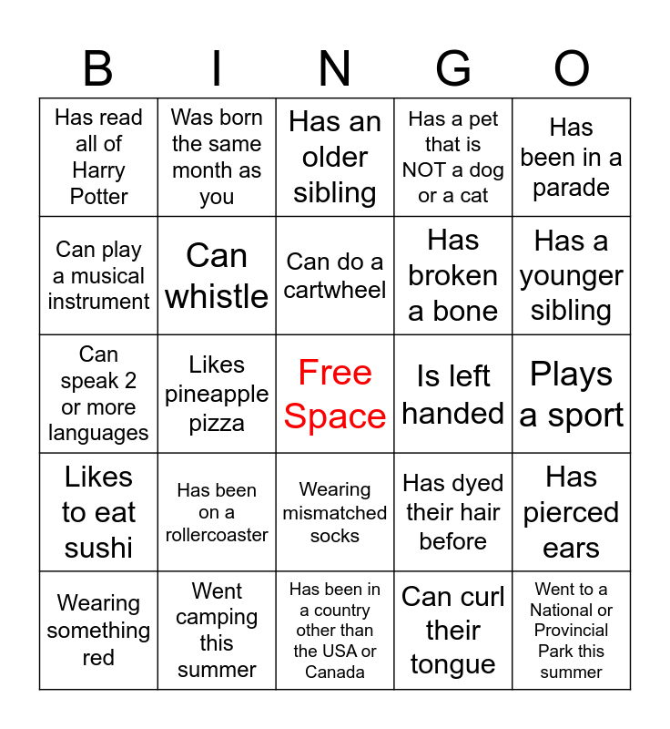 This bingo card has a free space and 24 words: Has been on a rollercoaster, Went camping this summer, Can do a cartwheel, Wearing something red, Has been in a parade, Has read all of Harry Potter, Can play a musical instrument, Was born the same month as you, Is left handed, Wearing mismatched socks, Has broken a bone, Can speak 2 or more languages, Has dyed their hair before, Has pierced ears, Can whistle, Can curl their tongue, Plays a sport, Has an older sibling, Has a younger sibling, Likes pineapple pizza, Went to a National or Provincial Park this summer, Likes to eat sushi, Has a pet that is NOT a dog or a cat and Has been in a country other than the USA or Canada.