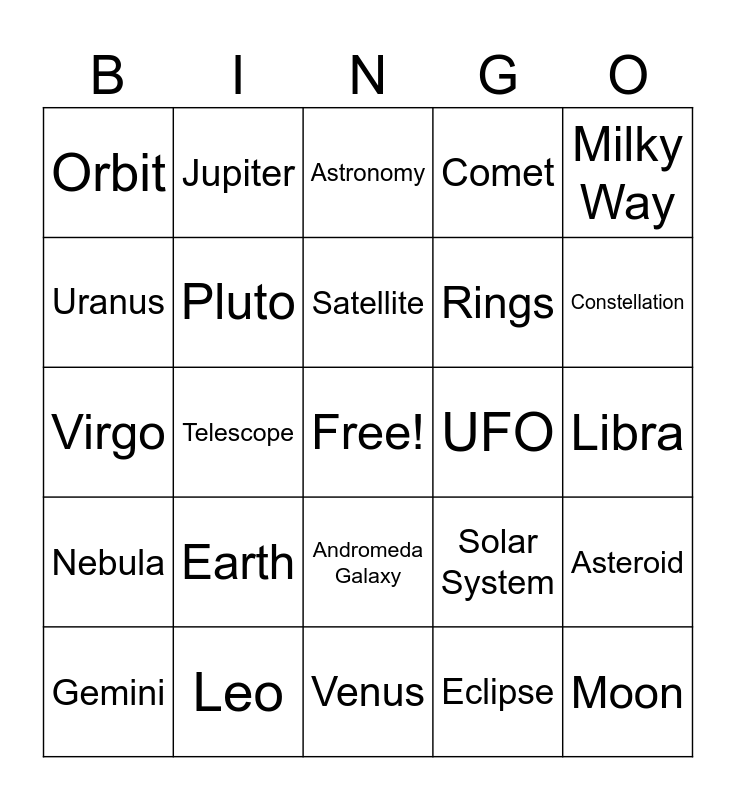 This bingo card has a free space and 50 words: Sun, Moon, Mercury, Venus, Earth, Mars, Jupiter, Saturn, Uranus, Neptune, Pluto, Comet, Asteroid, Solar System, Astronaut, Stars, Satellite, UFO, Black Hole, Milky Way, Telescope, Eclipse, Orbit, Rings, Galaxy, Supernova, Constellation, NASA, Astronomy, Andromeda Galaxy, Orion, Ursa Major, Ursa Minor, Cassiopeia, Leo, Aries, Scorpius, Sagittarius, Aquarius, Libra, Pisces, Cancer, Capricornus, Taurus, Gemini, Virgo, Shooting Star, Gravity, Nebula and Light Year.