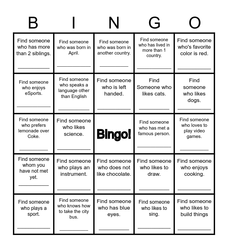 This bingo card has a free space and 25 words: Find someone who plays a sport. ____________, Find someone who plays an instrument. ___________, Find someone who is left handed. ___________, Find someone who likes to sing. ____________, Find someone who likes dogs. ___________, Find someone who has more than 2 siblings. ___________, Find someone who was born in April. _____________, Find someone who was born in another country. ___________, Find Someone who likes cats. __________, Find someone who enjoys cooking. ___________, Find someone who prefers lemonade over Coke. ___________, Find someone who speaks a language other than English ____________, Find someone who likes to draw. __________, Find someone who likes to build things ___________, Find someone who enjoys eSports. _____________, Find someone who knows how to take the city bus. ___________, Find someone who has blue eyes. __________, Find someone who has lived in more than 1 country. ______________, Find someone who loves to play video games. ___________, Find someone whom you have not met yet. ___________, Find someone who likes science. ___________, Find someone who does not like chocolate. ___________, Find someone who has met a famous person. _____________, Find someone who's favorite color is red. ___________ and Find someone who is wearing a blue shirt. ____________.