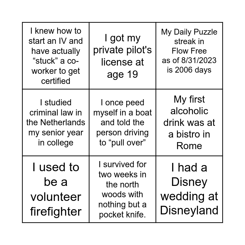 This bingo card has a free space and 8 words: My first alcoholic drink was at a bistro in Rome, My Daily Puzzle streak in Flow Free as of 8/31/2023 is 2006 days, I got my private pilot's license at age 19, I used to be a volunteer firefighter, I knew how to start an IV and have actually “stuck” a co-worker to get certified, I had a Disney wedding at Disneyland, I studied criminal law in the Netherlands my senior year in college and I survived for two weeks in the north woods with nothing but a pocket knife..
