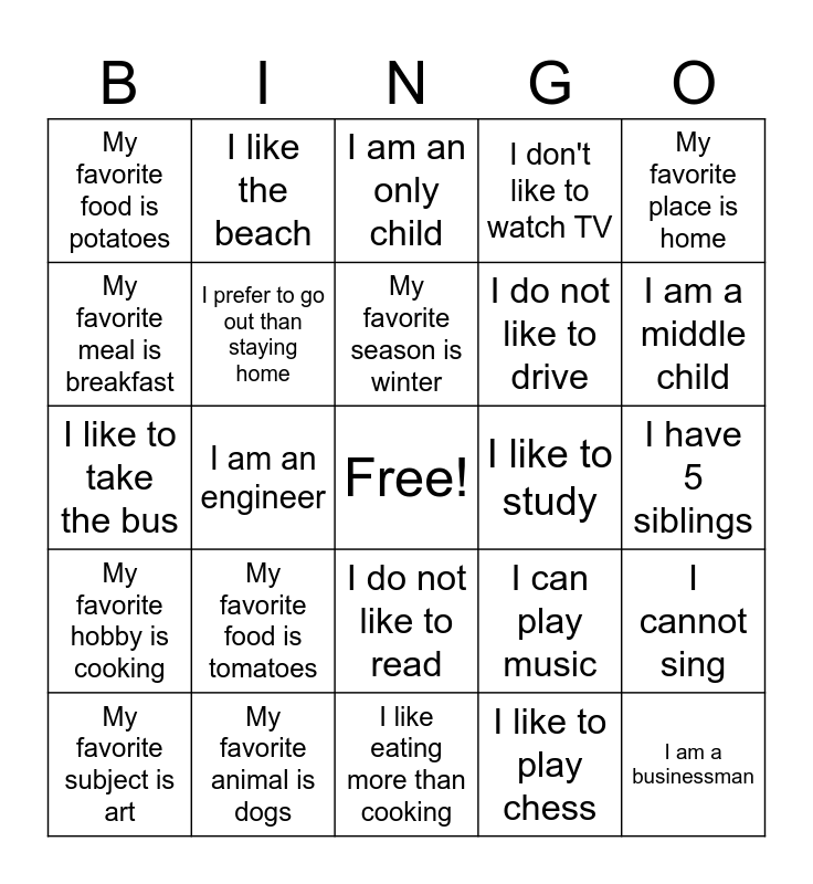 This bingo card has a free space and 24 words: My favorite food is tomatoes, My favorite animal is dogs, My favorite season is winter, My favorite subject is art, My favorite place is home, My favorite food is potatoes, My favorite meal is breakfast, I like the beach, I like to study, I do not like to read, I do not like to drive, I like to take the bus, I can play music, I cannot sing, I prefer to go out than staying home, I like to play chess, I have 5 siblings, I am an only child, I am a middle child, I am an engineer, I am a businessman, My favorite hobby is cooking, I don't like to watch TV and I like eating more than cooking.