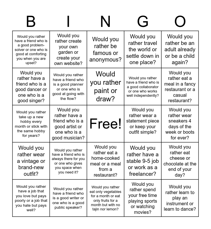 This bingo card has a free space and 24 words: Would you rather have a friend who is always there for you or one who gives you space when you need it?, Would you rather have a friend who is a good writer or one who is a good public speaker?, Would you rather paint or draw?, Would you rather have a job that you love but pays poorly or a job that you hate but pays well?, Would you rather be an adult already or be a child again?, Would you rather have a friend who is a good problem-solver or one who is good at comforting you when you are upset?, Would you rather have a friend who is a good dancer or one who is a good singer?, Would you rather create your own garden or create your own website?, Would you rather wear a statement piece or keep your outfit simple?, Would you rather eat a home-cooked meal or a meal from a restaurant?, Would you rather have a friend who is a good collaborator or one who works well independently?, Would you rather take up a new hobby every month or stick with the same hobby for years?, Would you rather have a stable 9-5 job or work as a freelancer?, Would you rather eat cheese or chocolate at the end of your day?, Would you rather have a friend who is a good planner or one who is good at going with the flow?, Would you rather spend your free time playing sports or watching movies?, Would you rather wear sneakers 4 days of the week or boots for ever?, Would you rather be famous or anonymous?, Would you rather eat a meal in a fancy restaurant or a casual restaurant?, Would you rather have a friend who is a good artist or one who is a good musician?, Would you rather learn to play an instrument or learn to dance?, Would you rather wear a vintage or brand-new outfit?, Would you rather travel the world or settle down in one place? and Would you rather eat only vegetables for a month or eat only fruits for a month but with no tajin nor lemon?.