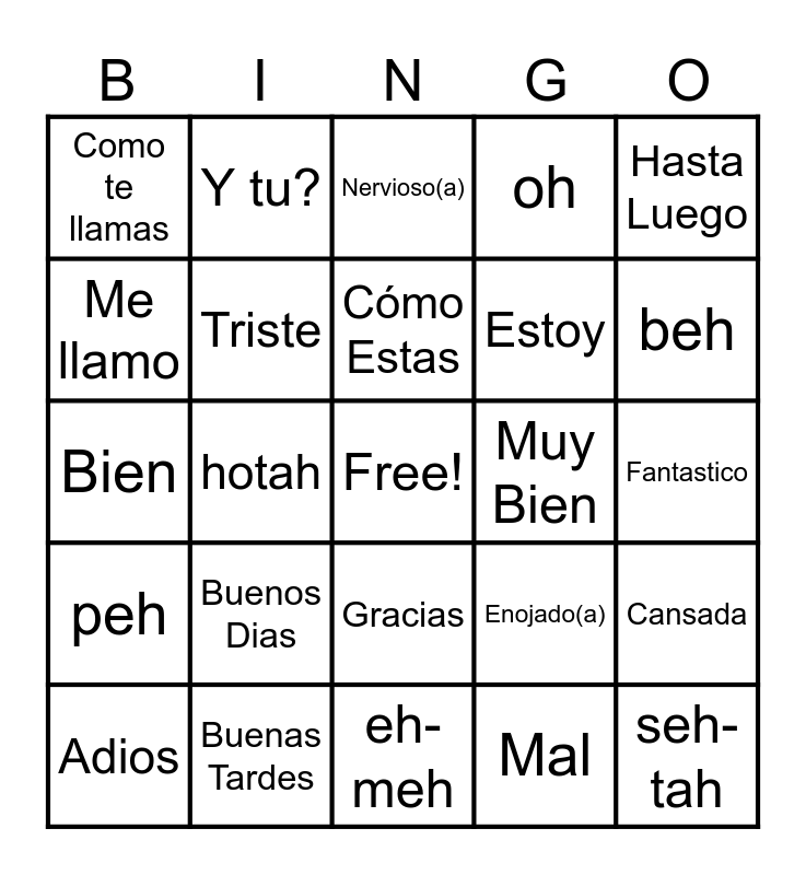 This bingo card has a free space and 24 words: Buenos Dias, Buenas Tardes, Cómo Estas, Adios, Hasta Luego, Como te llamas, Me llamo, Y tu?, Muy Bien, Gracias, Estoy, Bien, Enojado(a), Cansada, Triste, Mal, Fantastico, Nervioso(a), beh, hotah, seh-tah, peh, oh and eh-meh.