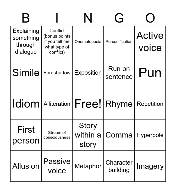 This bingo card has a free space and 27 words: Comma, Period, Run on sentence, Metaphor, Simile, Onomatopoeia, Conflict (bonus points if you tell me what type of conflict), First person, Rhyme, Hyperbole, Idiom, Personification, Allusion, Passive voice, Pun, Flashback, Foreshadow, Exposition, Stream of consciousness, Explaining something through dialogue, Repetition, Character building, Alliteration, Imagery, Story within a story, Active voice and Oxymoron.