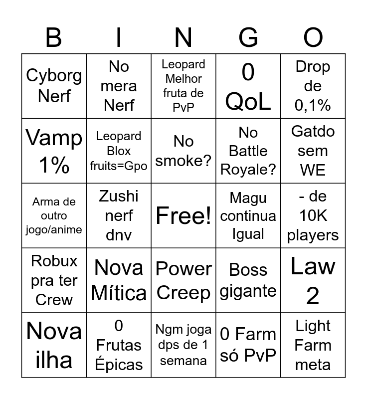 This bingo card has a free space and 24 words: Nova Mítica, 0 Frutas Épicas, No smoke?, Nova ilha, Drop de 0,1%, Cyborg Nerf, Vamp 1%, No mera Nerf, Magu continua Igual, Power Creep, No Battle Royale?, Arma de outro jogo/anime, Boss gigante, Law 2, Leopard Blox fruits=Gpo, 0 Farm só PvP, - de 10K players, Leopard Melhor fruta de PvP, Gatdo sem WE, Zushi nerf dnv, Light Farm meta, Robux pra ter Crew, 0 QoL and Ngm joga dps de 1 semana.
