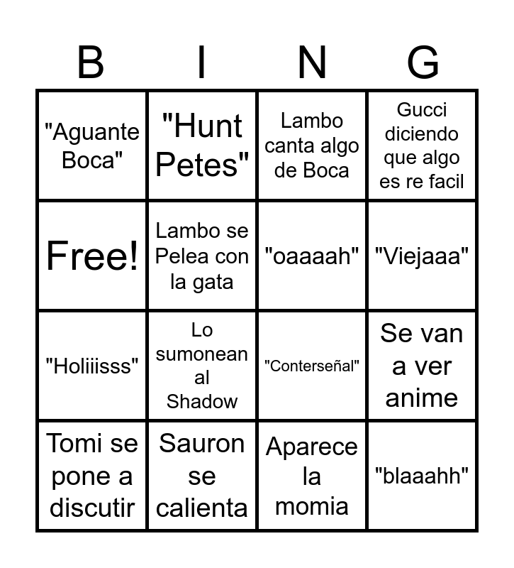 This bingo card has 16 words: Sauron se calienta, Se van a ver anime, Lambo canta algo de Boca, "Aguante Boca", "Holiiisss", "Hunt Petes", "Conterseñal", Aparece la momia, Free!, Lambo se Pelea con la gata, Tomi se pone a discutir, Gucci diciendo que algo es re facil, Lo sumonean al Shadow, "Viejaaa", "oaaaah" and "blaaahh".