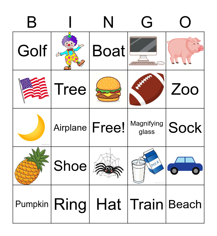 This bingo card has 14 images, a free space and 15 words: Pumpkin, Snake, Airplane, Horse, Golf, Boat, Tree, Shoe, Magnifying glass, Ring, Sock, Beach, Hat, Train and Zoo.