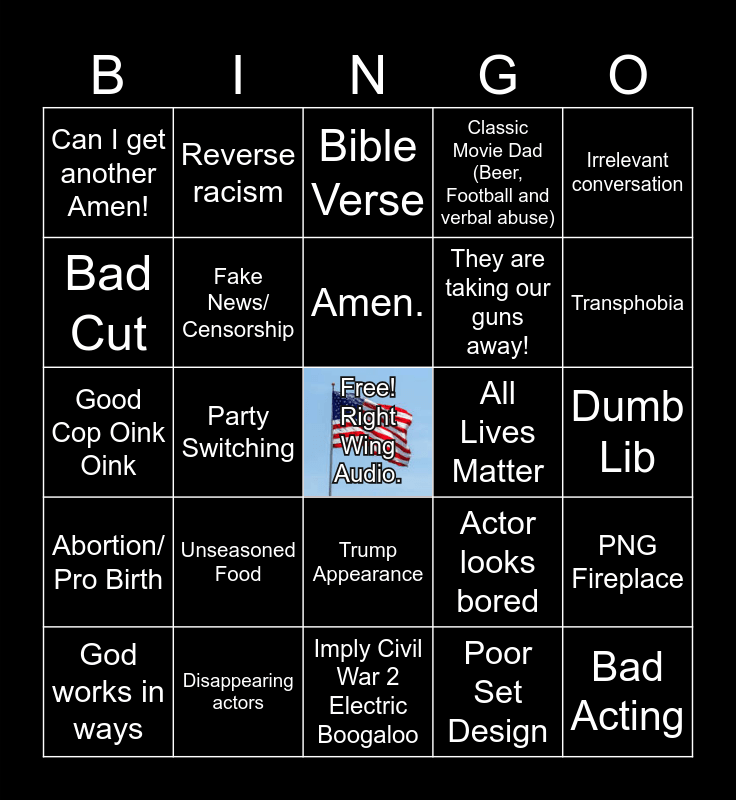 This bingo card has a free space and 28 words: PNG Fireplace, OOooo, FIGHT!, They are taking our guns away!, Poor Set Design, Bad Cut, Bible Verse, Reverse racism, Abortion/ Pro Birth, All Lives Matter, God works in ways, Good Cop Oink Oink, Classic Movie Dad (Beer, Football and verbal abuse), Disappearing actors, Imply Civil War 2 Electric Boogaloo, Transphobia, Antifa /BLM Terrorist, Unseasoned Food, Fake News/ Censorship, Amen., Trump Appearance, Can I get another Amen!, Hitler, Bad Acting, Party Switching, Dumb Lib, Actor looks bored, Irrelevant conversation and Funko Pops!.