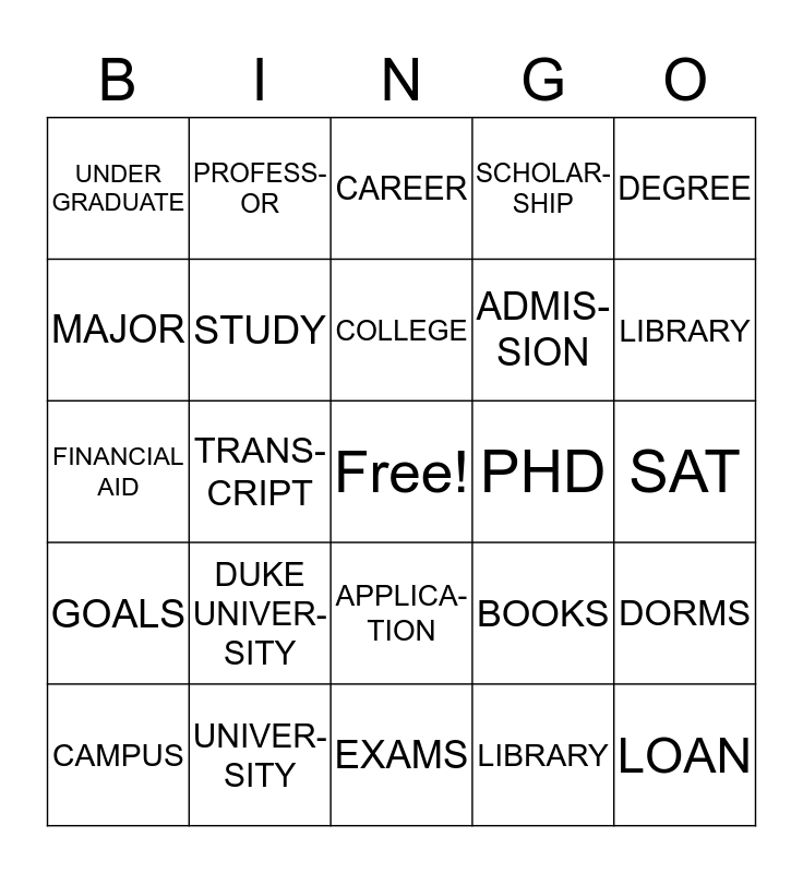 This bingo card has a free space and 24 words: DUKE UNIVER- SITY, UNIVER- SITY, COLLEGE, CAMPUS, DEGREE, UNDER GRADUATE, MAJOR, PROFESS-OR, PHD, APPLICA- TION, ADMIS- SION, FINANCIAL AID, BOOKS, DORMS, STUDY, LIBRARY, SAT, CAREER, LIBRARY, TRANS- CRIPT, LOAN, GOALS, SCHOLAR- SHIP and EXAMS.