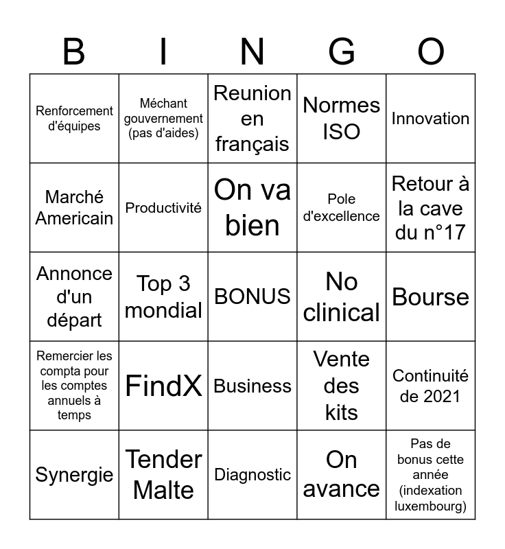 This bingo card has a free space and 24 words: FindX, Tender Malte, On va bien, Synergie, Innovation, Renforcement d'équipes, Marché Americain, Méchant gouvernement (pas d'aides), No clinical, Business, Pole d'excellence, Annonce d'un départ, Vente des kits, Continuité de 2021, Productivité, On avance, Bourse, Reunion en français, Retour à la cave du n°17, Top 3 mondial, Pas de bonus cette année (indexation luxembourg), Remercier les compta pour les comptes annuels à temps, Normes ISO and Diagnostic.
