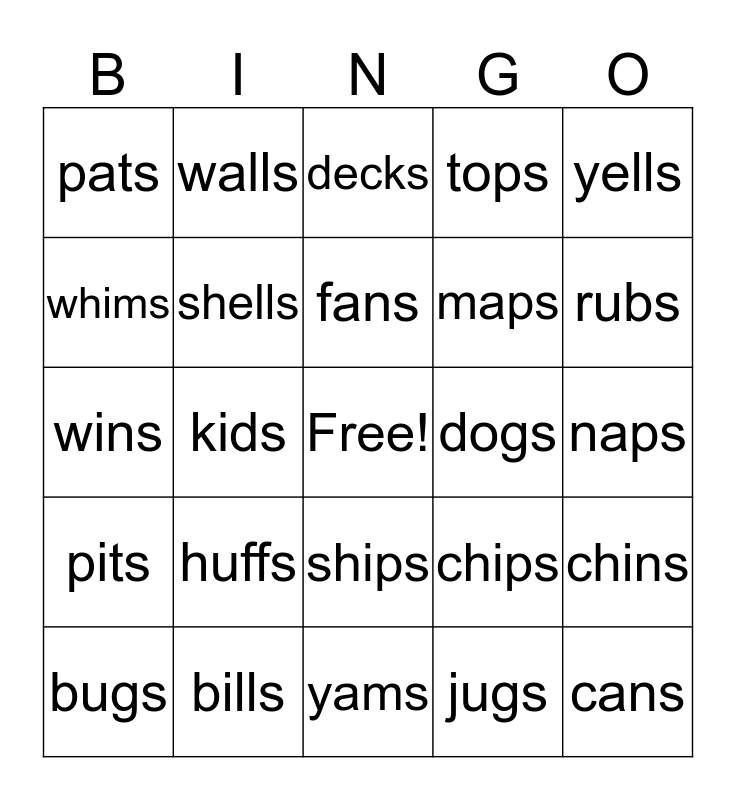 This bingo card has a free space and 27 words: chips, locks, maps, yams, whims, decks, walls, pits, dogs, chins, wins, tops, bugs, bills, rubs, sips, shells, fans, huffs, pats, naps, jugs, kids, cans, ships, yells and robs.