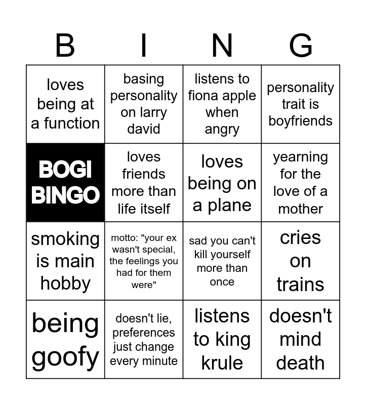 This bingo card has 17 words: being goofy, doesn't lie, preferences just change every minute, listens to fiona apple when angry, personality trait is boyfriends, smoking is main hobby, loves friends more than life itself, sad you can't kill yourself more than once, yearning for the love of a mother, BOGI BINGO, motto: "your ex wasn't special, the feelings you had for them were", listens to king krule, cries on trains, loves being at a function, basing personality on larry david, loves being on a plane, doesn't mind death and being goofy.