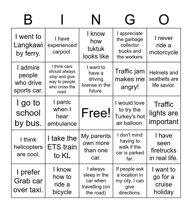 This bingo card has a free space and 24 words: I take the ETS train to KL, I know how to ride a bicycle, I want to have a driving license in the future., I prefer Grab car over taxi., I never ride a motorcycle, I went to Langkawi by ferry., I admire people who drive sports car., I have experienced carpool., I would love to try the Turkey's hot air balloon., My parents own more than one car., Traffic jam makes me angry!, I go to school by bus., I don't mind having to walk if the car is parked far., I have seen firetrucks in real life., I think cars should always stop and give way to people who cross the road., If people ask a location in my city, I can give directions., Traffic lights are important, I know how tuktuk looks like, Helmets and seatbelts are life savior., I panic when I hear ambulance, I want to go for a cruise holiday, I think helicopters are cool., I appreciate the garbage collector trucks and the workers and I always sleep in the car when travelling (on the road).