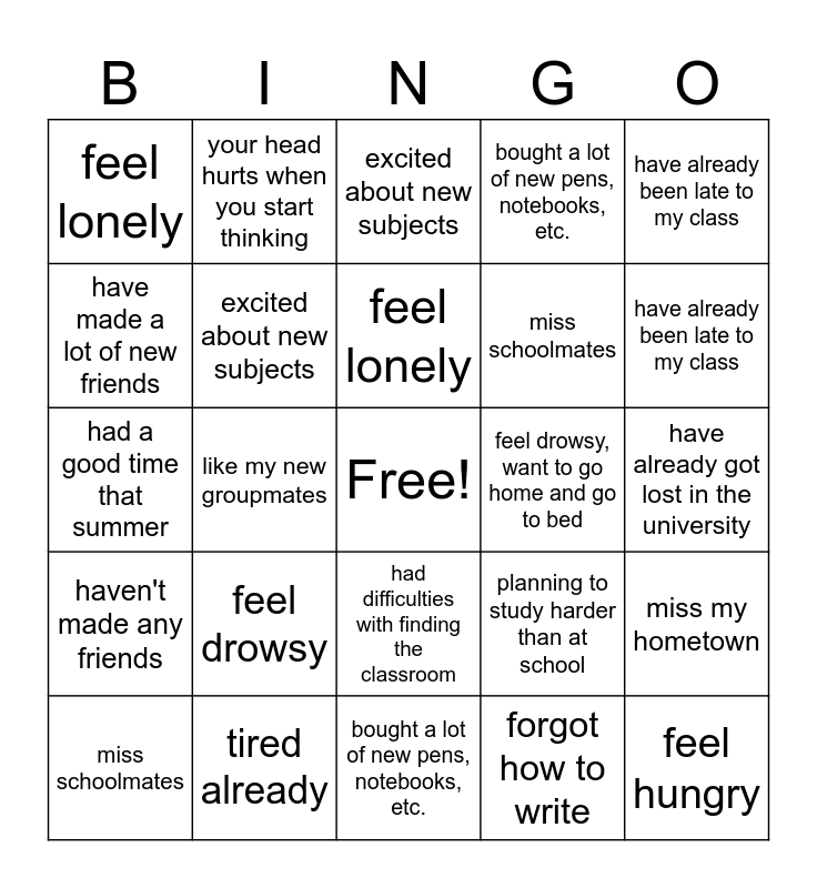 This bingo card has a free space and 38 words: have made a lot of new friends, haven't made any friends, happy to study again, excited about new subjects, miss my hometown, feel drowsy, feel lonely, tired already, have already been late to my class, miss schoolmates, like my new groupmates, bought a lot of new pens, notebooks, etc., feel hungry, have already got lost in the university, have made a lot of new friends, haven't made any friends, happy to study again, excited about new subjects, miss my hometown, feel drowsy, want to go home and go to bed, feel lonely, tired already, have already been late to my class, miss schoolmates, like my new groupmates, bought a lot of new pens, notebooks, etc., feel hungry, have already got lost in the university, summer was too short, remember all the teachers' names, hate getting up early, had difficulties with finding the classroom, forgot how to write, your head hurts when you start thinking, don't have a pen, had to borrow it from a groupmate, planning to study harder than at school, had a good time that summer and feel very productive.