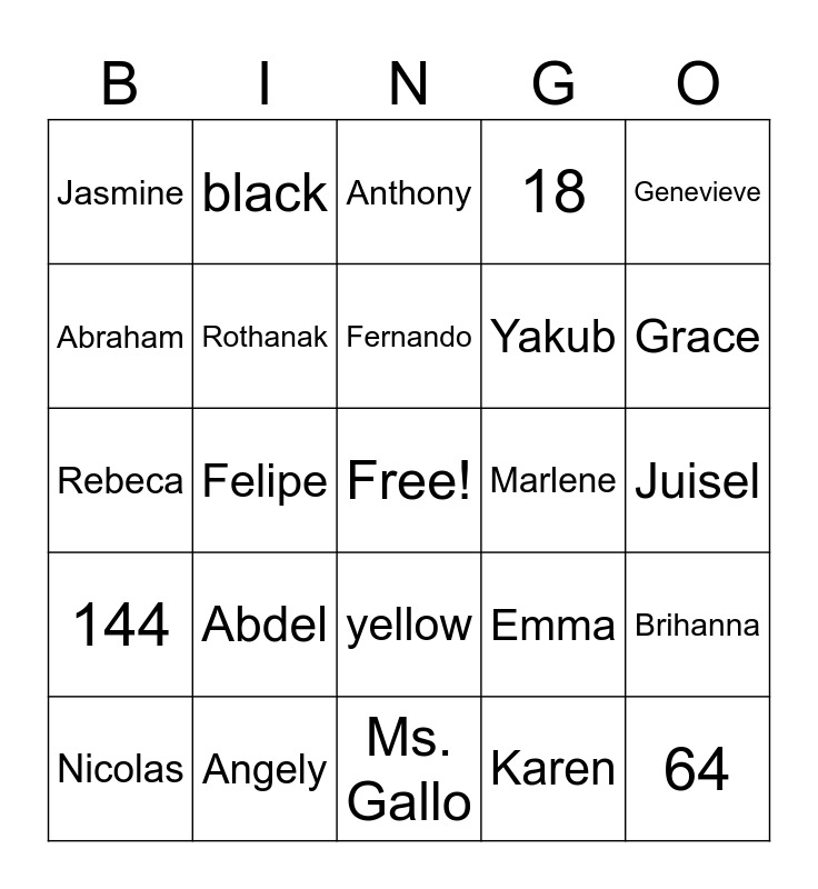 This bingo card has a free space and 24 words: Abdel, Angely, Fernando, Nicolas, Genevieve, Jasmine, Abraham, black, Marlene, yellow, Yakub, Rebeca, Emma, Brihanna, Rothanak, Karen, Juisel, Anthony, Grace, Felipe, 64, 144, 18 and Ms. Gallo.