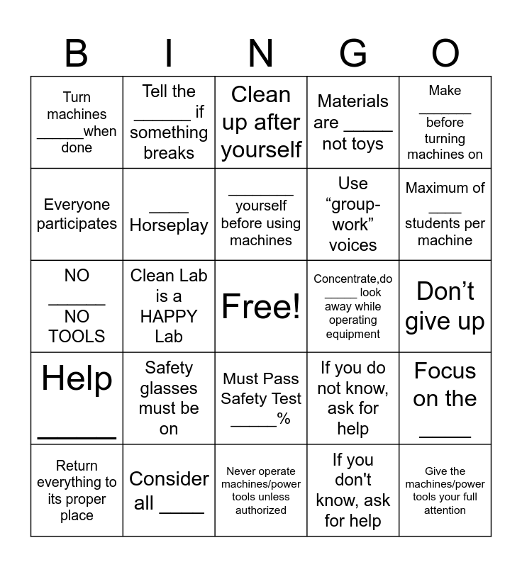 This bingo card has a free space and 24 words: Return everything to its proper place, Safety glasses must be on, ________ yourself before using machines, If you don't know, ask for help, Make _______ before turning machines on, Turn machines ______when done, Tell the ______ if something breaks, Clean up after yourself, Concentrate,do _____ look away while operating equipment, Don’t give up, NO ______ NO TOOLS, ____ Horseplay, If you do not know, ask for help, Focus on the ____, Everyone participates, Consider all ____, Never operate machines/power tools unless authorized, Materials are _____ not toys, Maximum of ____ students per machine, Help ____, Clean Lab is a HAPPY Lab, Must Pass Safety Test _____%, Use “group-work” voices and Give the machines/power tools your full attention.
