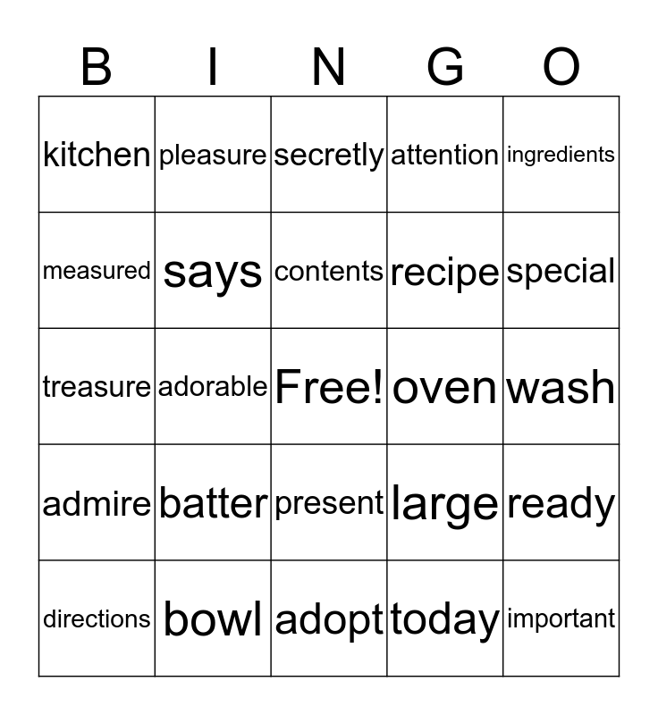 This bingo card has a free space and 24 words: batter, bowl, contents, directions, ingredients, kitchen, measured, pleasure, oven, present, recipe, treasure, large, ready, says, today, wash, secretly, special, adorable, important, admire, attention and adopt.