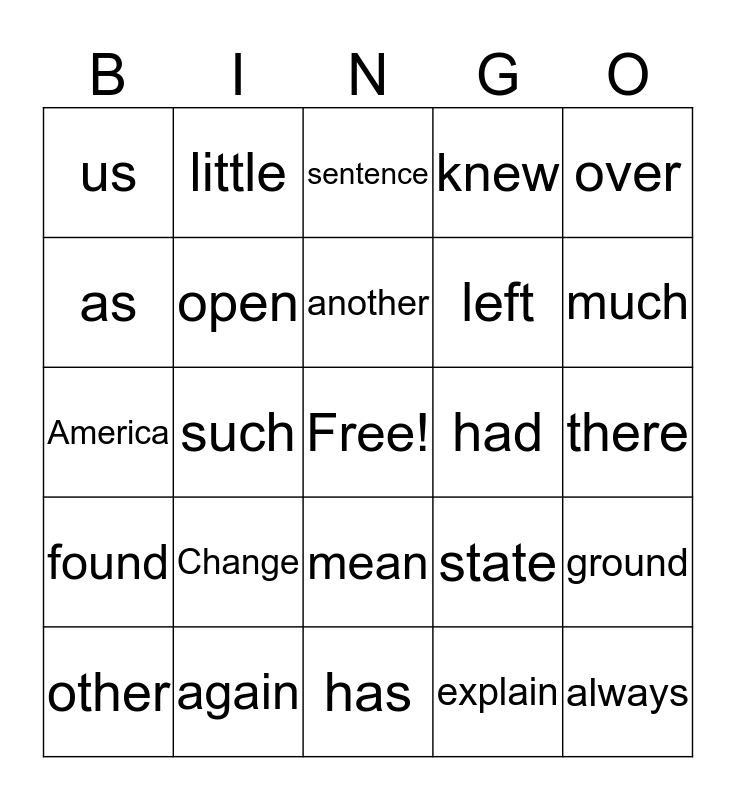 This bingo card has a free space and 24 words: Change, again, another, other, over, us, as, little, had, mean, left, America, state, ground, open, explain, there, sentence, much, such, always, found, knew and has.
