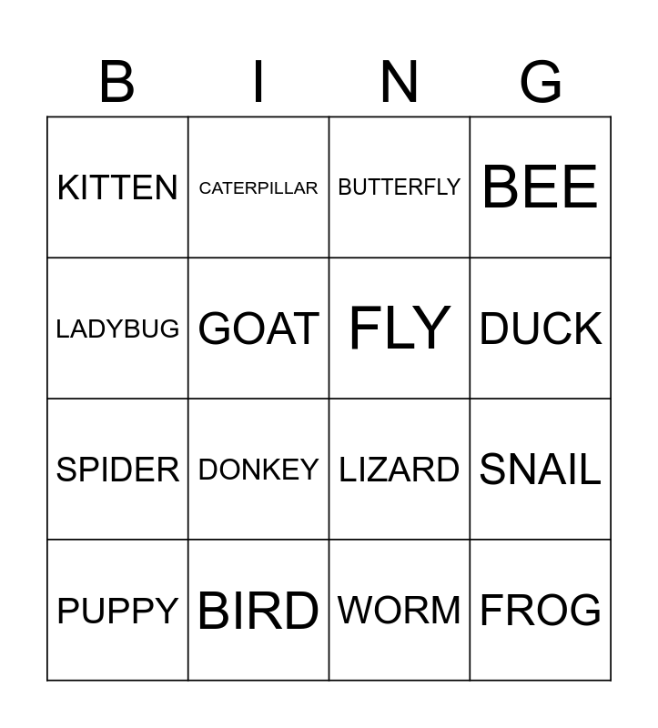 This bingo card has 16 words: BIRD, SNAIL, BUTTERFLY, KITTEN, SPIDER, CATERPILLAR, LIZARD, WORM, LADYBUG, GOAT, PUPPY, BEE, DONKEY, DUCK, FLY and FROG.