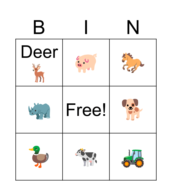 This bingo card has a free space and 11 words: 🐑, 🐄, 🚜, 🦆, 🐖, 🐎, 🐕, 🐁, 🦏, Deer 🦌 and 🐊.
