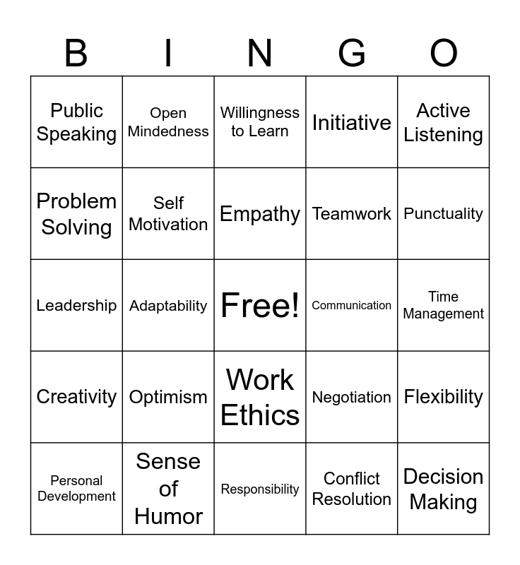 This bingo card has a free space and 24 words: Optimism, Sense of Humor, Empathy, Personal Development, Active Listening, Public Speaking, Problem Solving, Open Mindedness, Communication, Work Ethics, Teamwork, Leadership, Negotiation, Flexibility, Self Motivation, Conflict Resolution, Time Management, Willingness to Learn, Punctuality, Adaptability, Decision Making, Creativity, Initiative and Responsibility.