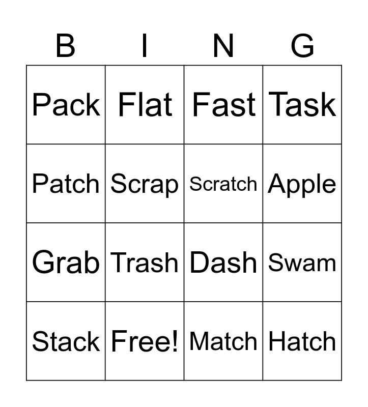 This bingo card has 16 words: Free!, Swam, Fast, Pack, Grab, Flat, Dash, Match, Patch, Scrap, Stack, Task, Trash, Apple, Scratch and Hatch.
