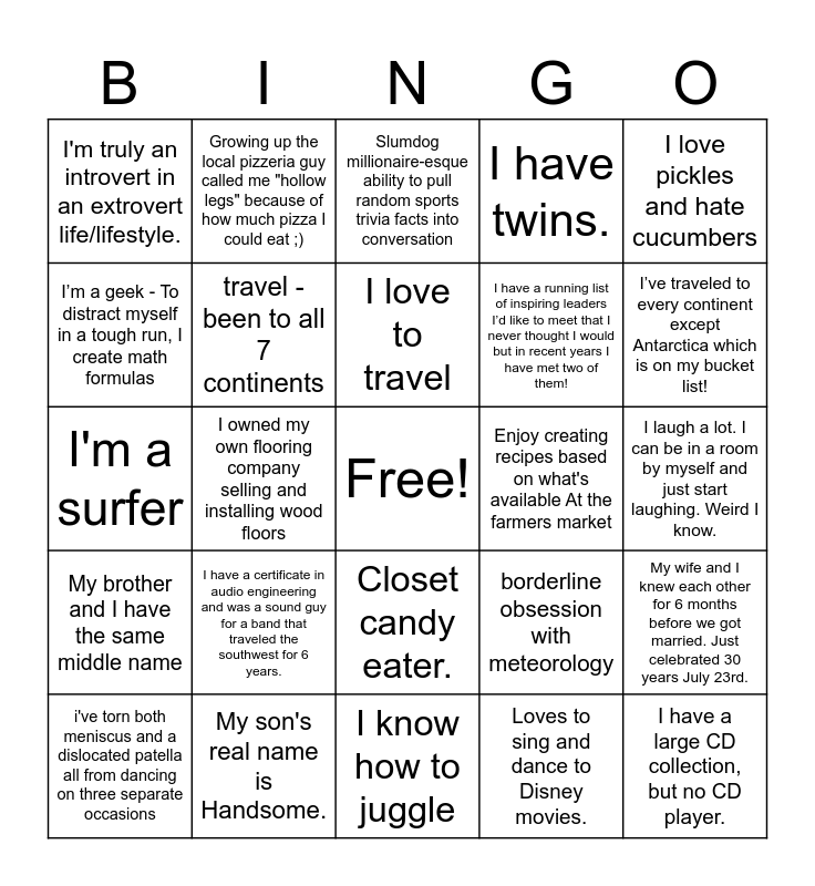 This bingo card has a free space and 45 words: Have played trumpet since I was 10., I have a large CD collection, but no CD player., I am a plant person. May not be able to keep them alive for that long but I love having them., i've torn both meniscus and a dislocated patella all from dancing on three separate occasions, I think I'm hilarious!, Loves to sing and dance to Disney movies., Slumdog millionaire-esque ability to pull random sports trivia facts into conversation, when I was little, I wanted to be a race car driver when I grew up., I love pickles and hate cucumbers, My son's real name is Handsome., I have twins., Enjoy creating recipes based on what's available At the farmers market, Closet candy eater., I have a certificate in audio engineering and was a sound guy for a band that traveled the southwest for 6 years., I was born on an island, I know how to juggle, Nicest Celeb I Have Served: Peyton Manning, I'm a surfer, Can’t carry a tune, but love to sing., I’ve traveled to every continent except Antarctica which is on my bucket list!, Growing up the local pizzeria guy called me "hollow legs" because of how much pizza I could eat ;), gone horseback riding in more than 15 countries, I am double jointed., I'm truly an introvert in an extrovert life/lifestyle., When I was a kid, it was my dream to open a Scooby-Doo themed restaurant., I laugh a lot. I can be in a room by myself and just start laughing. Weird I know., i ate a bug/insect for money, I can't function on a bad hair day, borderline obsession with meteorology, My brother and I have the same middle name, I check toilets every single time because- Candyman., My wife and I knew each other for 6 months before we got married. Just celebrated 30 years July 23rd., I met my husband in 4th grade, Enjoy exploring farmers markets when I'm traveling, Fantasy fiction book addict., I owned my own flooring company selling and installing wood floors, I can't swim., I can recite the entire alphabet backwards, Nickname When I was Little: Amanda Claire the Panda Bear, I love to travel, I’m a geek - To distract myself in a tough run, I create math formulas, I have a running list of inspiring leaders I’d like to meet that I never thought I would but in recent years I have met two of them!, In college I got a concussion slam dancing, travel - been to all 7 continents and my genetics/lineage.