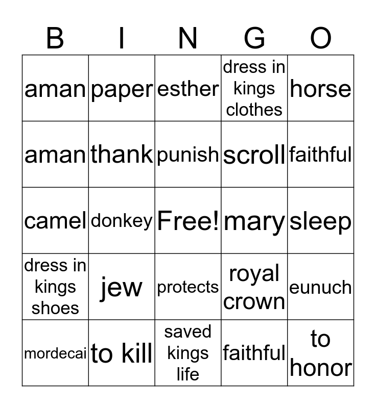 This bingo card has a free space and 24 words: jew, to kill, punish, mordecai, horse, aman, aman, paper, mary, protects, scroll, camel, royal crown, eunuch, thank, faithful, sleep, esther, faithful, donkey, to honor, dress in kings shoes, dress in kings clothes and saved kings life.