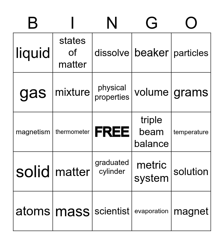 This bingo card has a free space and 24 words: matter, mass, physical properties, atoms, particles, liquid, gas, states of matter, triple beam balance, graduated cylinder, volume, magnetism, metric system, solution, mixture, evaporation, temperature, dissolve, grams, thermometer, magnet, solid, beaker and scientist.