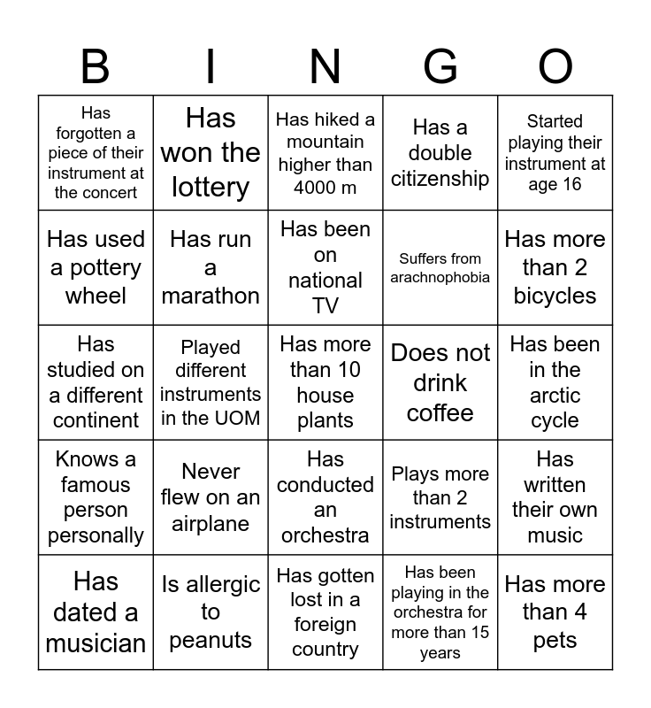 This bingo card has 25 words: Never flew on an airplane, Has gotten lost in a foreign country, Has been on national TV, Has dated a musician, Started playing their instrument at age 16, Has forgotten a piece of their instrument at the concert, Has used a pottery wheel, Has won the lottery, Does not drink coffee, Has conducted an orchestra, Suffers from arachnophobia, Has studied on a different continent, Plays more than 2 instruments, Has written their own music, Has run a marathon, Has more than 4 pets, Has been in the arctic cycle, Has hiked a mountain higher than 4000 m, Has more than 2 bicycles, Played different instruments in the UOM, Has more than 10 house plants, Is allergic to peanuts, Knows a famous person personally, Has a double citizenship and Has been playing in the orchestra for more than 15 years.