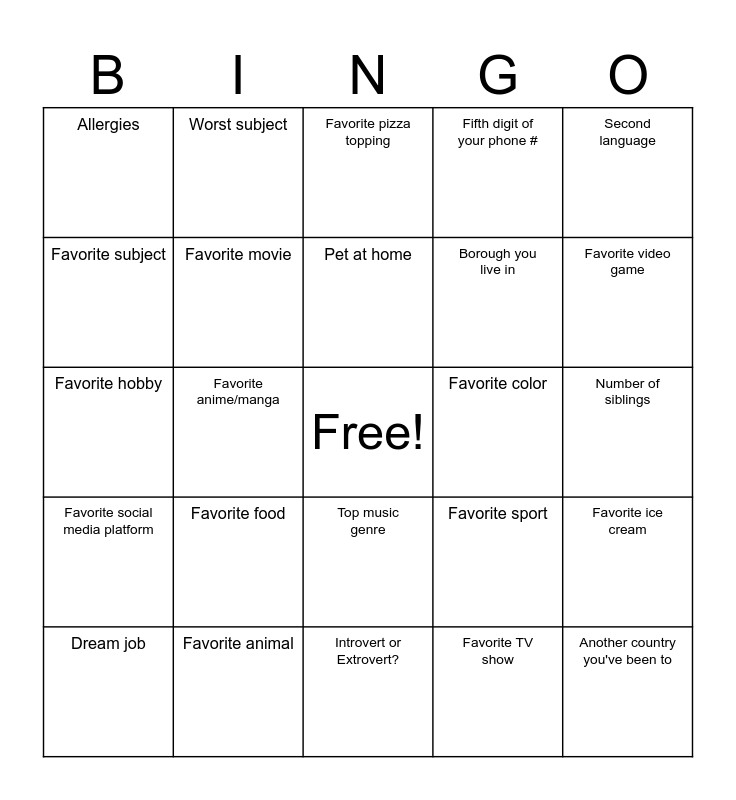 This bingo card has a free space and 24 words: Favorite food, Favorite animal, Pet at home, Dream job, Second language, Allergies, Favorite subject, Worst subject, Favorite color, Top music genre, Borough you live in, Favorite hobby, Favorite sport, Favorite ice cream, Favorite movie, Favorite TV show, Number of siblings, Favorite pizza topping, Favorite video game, Favorite anime/manga, Another country you've been to, Favorite social media platform, Fifth digit of your phone # and Introvert or Extrovert?.