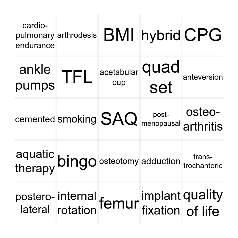 This bingo card has 25 words: bingo, femur, acetabular cup, postero- lateral, CPG, cardio- pulmonary endurance, ankle pumps, arthrodesis, post- menopausal, osteotomy, quad set, cemented, adduction, trans- trochanteric, TFL, quality of life, osteo- arthritis, BMI, anteversion, smoking, SAQ, internal rotation, aquatic therapy, hybrid and implant fixation.