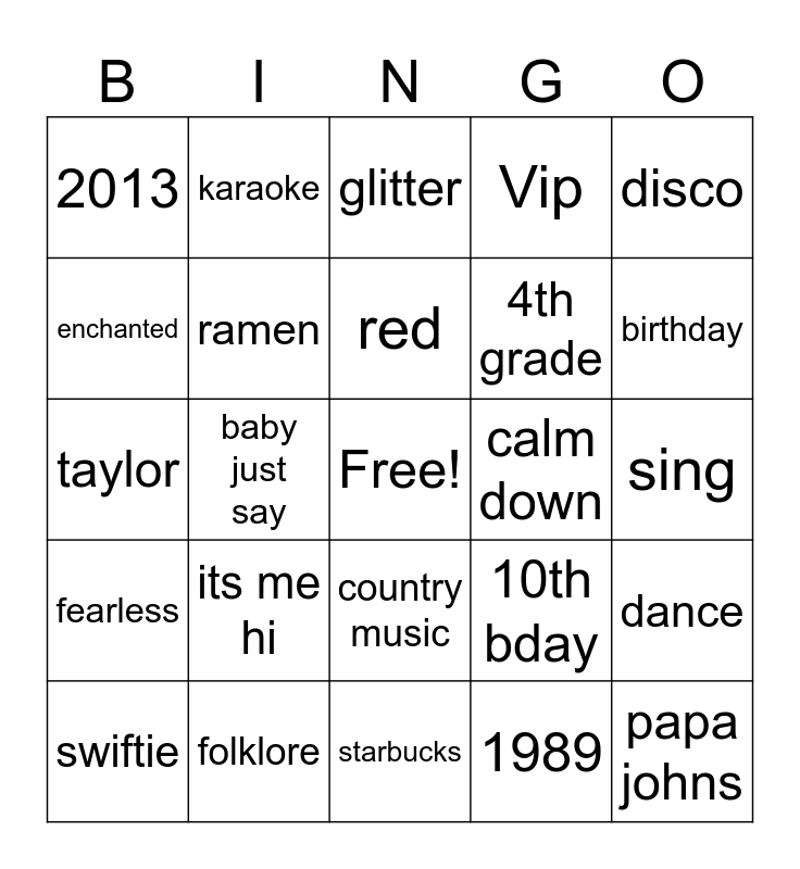 This bingo card has a free space and 29 words: swiftie, cinnamon roll, baby just say, eras tour, 2013, glitter, ramen, its me hi, calm down, folklore, sing, papa johns, starbucks, 1989, birthday, trouble, country music, fearless, disco, taylor, 10th bday, shake it off, 4th grade, enchanted, Vip, karaoke, dance, red and velvet.