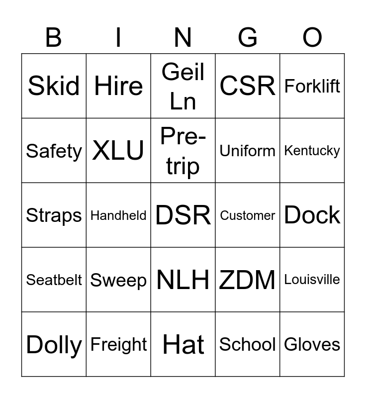 This bingo card has 41 words: Free!, Straps, FAC, XLU, Freight, NLH, Pre-trip, Post-trip, Forklift, Seatbelt, Handheld, CSR, DSR, Dock, Customer, Sweep, Dunnage, Skid, PTO, Geil Ln, Louisville, Gloves, Hat, Uniform, Dispatch, HazMat, School, DMV, Kentucky, Indiana, Brake, Hire, Dolly, Swap, ZDM, Safety, FOS, Pup, Liftgate, Doubles and Dock Plate.