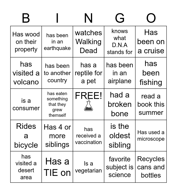 This bingo card has a free space and 24 words: Has 4 or more siblings, Has a TIE on, has a reptile for a pet, has visited a desert area, Has been on a cruise, Has wood on their property, has visited a volcano, has been in an earthquake, had a broken bone, has received a vaccination, has been in an airplane, is a consumer, is the oldest sibling, Has used a microscope, has been to another country, favorite subject is science, read a book this summer, watches Walking Dead, has been fishing, has eaten something that they grew themself, Recycles cans and bottles, Rides a bicycle, knows what D.N.A stands for and Is a vegetarian.