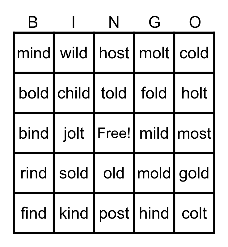 This bingo card has a free space and 24 words: sold, kind, told, find, cold, mind, bold, wild, mild, old, fold, bind, mold, gold, child, hind, most, host, holt, jolt, colt, rind, molt and post.