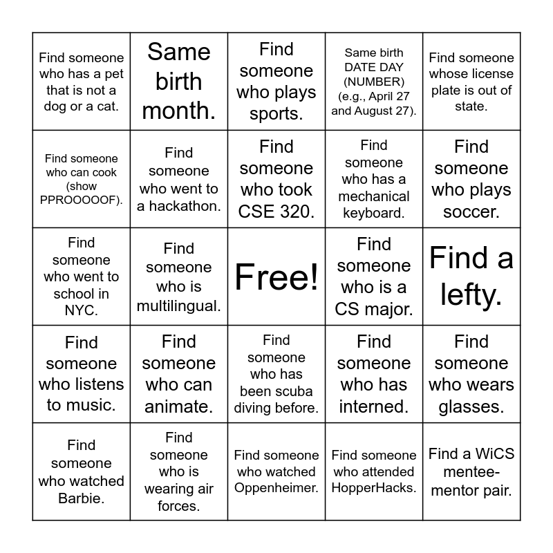 This bingo card has a free space and 27 words: Find someone who has interned., Find someone who regularly goes to the gym., Find someone who has a mechanical keyboard., Find someone who watched Oppenheimer., Find someone who can cook (show PPROOOOOF)., Find someone who plays sports., Same birth month., Find someone who listens to music., Find someone who is a CS major., Find someone who wears glasses., Find someone who went to school in NYC., Same birth DATE DAY (NUMBER) (e.g., April 27 and August 27)., Find someone who watched Barbie., Find someone who is wearing air forces., Find someone who plays soccer., Find someone who has a WiCS sticker., Find someone who went to a hackathon., Find someone who took CSE 320., Find someone who can animate., Find someone who has a pet that is not a dog or a cat., Find a lefty., Find someone who attended HopperHacks., Find someone who is multilingual., Find a WiCS mentee-mentor pair., Find someone who has been scuba diving before., Find someone whose license plate is out of state. and Find an international student..