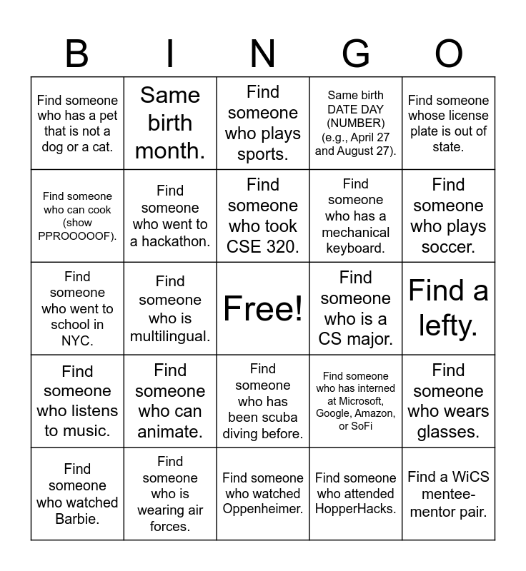 This bingo card has a free space and 27 words: Find someone who has interned at Microsoft, Google, Amazon, or SoFi, Find someone who regularly goes to the gym., Find someone who has a mechanical keyboard., Find someone who watched Oppenheimer., Find someone who can cook (show PPROOOOOF)., Find someone who plays sports., Same birth month., Find someone who listens to music., Find someone who is a CS major., Find someone who wears glasses., Find someone who went to school in NYC., Same birth DATE DAY (NUMBER) (e.g., April 27 and August 27)., Find someone who watched Barbie., Find someone who is wearing air forces., Find someone who plays soccer., Find someone who has a WiCS sticker., Find someone who went to a hackathon., Find someone who took CSE 320., Find someone who can animate., Find someone who has a pet that is not a dog or a cat., Find a lefty., Find someone who attended HopperHacks., Find someone who is multilingual., Find a WiCS mentee-mentor pair., Find someone who has been scuba diving before., Find someone whose license plate is out of state. and Find an international student..