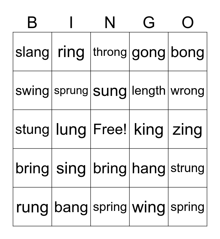 This bingo card has a free space and 24 words: sing, bang, sung, rung, bong, slang, swing, ring, king, bring, length, stung, hang, strung, sprung, wing, zing, throng, wrong, lung, spring, bring, gong and spring.