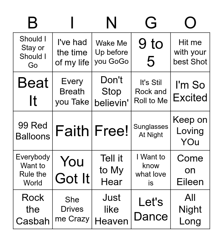 This bingo card has a free space and 75 words: Take on Me, Africa, Wake Me Up before you GoGo, Hungry Like the Wolf, Girls Just want to have fun, We built this city, Sweet Dreams, Maneater, Karma Chameleon, Billie Jean, Jessie's Girl, Eye of the Tiger, Don't Stop believin', Beat It, Uptown Girl, Faith, We Didn't Start the Fire, All Night Long, Love Shack, Hit me with your best Shot, Kiss, 99 Red Balloons, Every Breath you Take, I've had the time of my life, 9 to 5, Dancing in the Dark, Danger Zone, Don't You (forget about me), Down Under, Easy Lover, Footloose, Holding out for a Hero, I wanna dance with somebody, I Want to know what love is, I'm So Excited, It's Stil Rock and Roll to Me, I'm Gonna Be (500Miles), Jump (For my love), Keep on Loving YOu, Let's Dance, Let's Hear It for the Boy, Material Girl, My Prerogative, Never Gonna Give You Up, Nothing's Gonna Stop Us Now, Oh Sherrie, Rock the Casbah, Should I Stay or Should I Go, Straight Up, Take Me Home Tonight, Take My Breath Away, Tell it to My Hear, The Power of Love, Thriller, Total Eclipse of the Hear, Walk like an Egyptian, What I Like About You, Whip It, Who Can it be Now, You Can Call Me Al, You Got It, You Make My Dreams (come true), Your Love, You Spin Me Round, What a feeling, Sunglasses At Night, Time After Time, How Will I Know, Jump, Come on Eileen, Everybody Want to Rule the World, She Drives me Crazy, Blue Monday, Just like Heaven and Don't YOu Want Me.